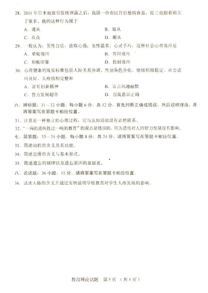 2011年全国成人高考专升本《教育理论》试题及答案